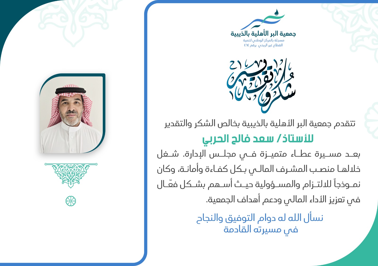 • كل الشكر والتقدير للأستاذ / سعد فالح الحربي، نظير جهوده المتميزة خلال فترة عمله مشرفًا ماليًا، حيث اتسم أداؤه بالكفاءة والأمانة، وأسهم بشكل مباشر في تعزيز الأداء المالي ودعم استقرار أعمال الجمعية.