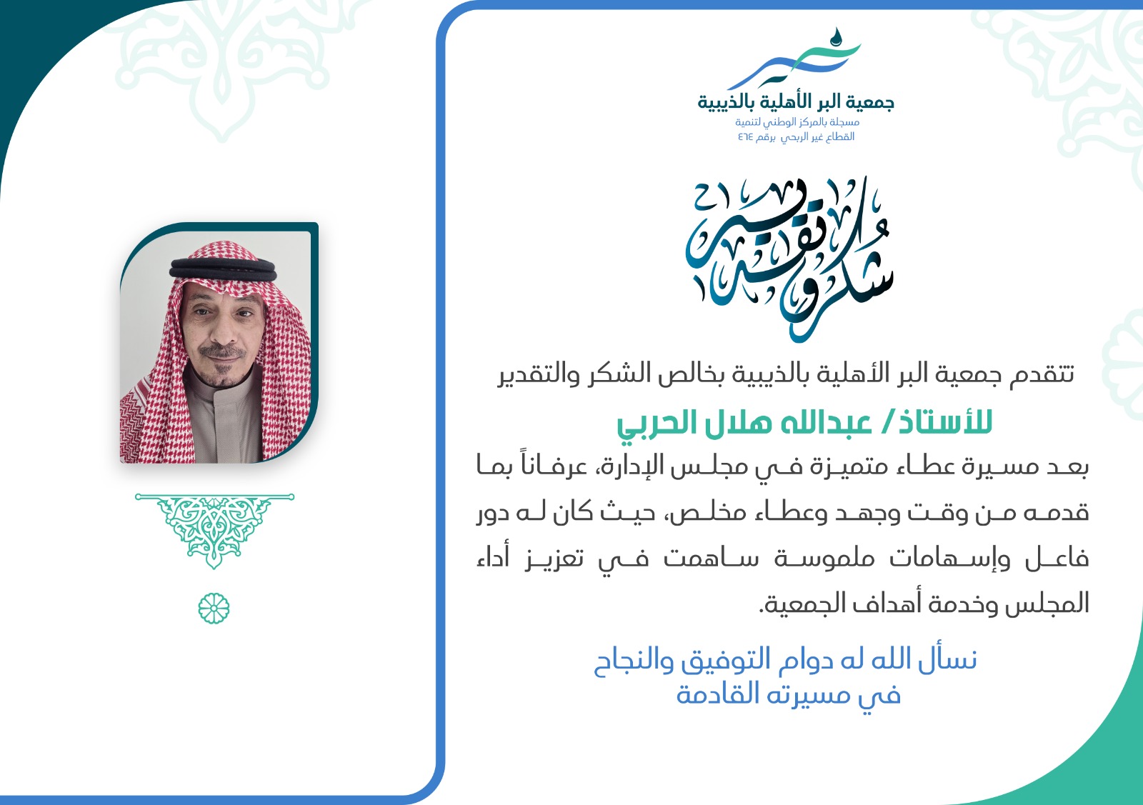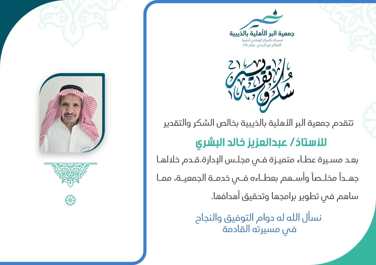 • كل الشكر والتقدير للأستاذ / عبدالعزيز خالد البشري، عرفانًا بما بذله من جهد مخلص وإسهامات مؤثرة ساهمت في خدمة برامج الجمعية وتحقيق أهدافها التنموية.